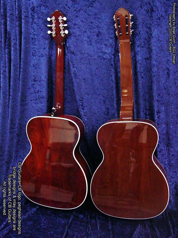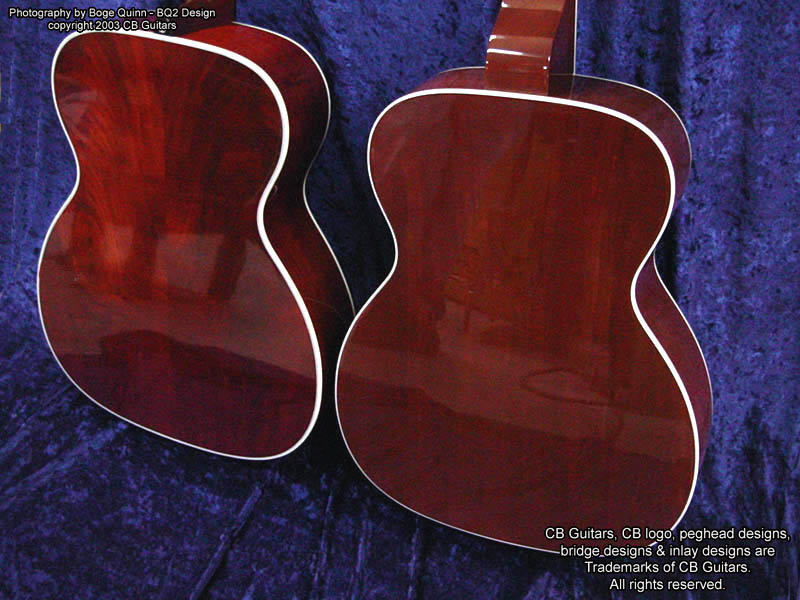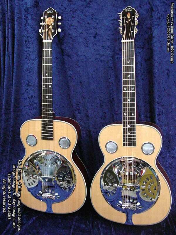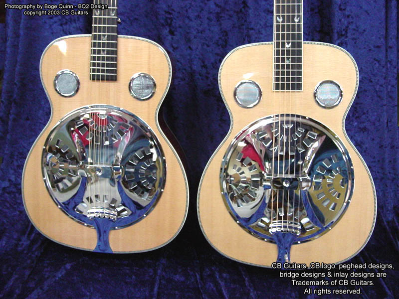 Recently, we had the opportunity to photograph the first CB-ROM, owned by Jimmy Wood, alongside the first Squareneck CB-ROM, owned by Tom Harrison. The guitars are identical in nearly every respect, excepting only the neck design. Tone woods used and internal construction features are identical. Click this link for sound samples of CB instruments. (click pictures for larger version)