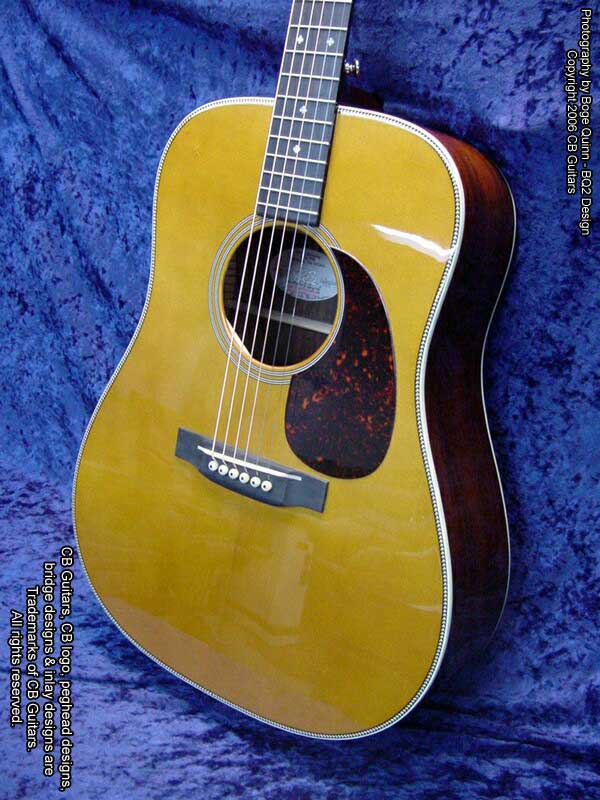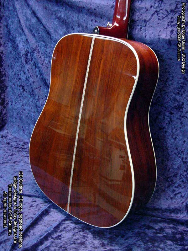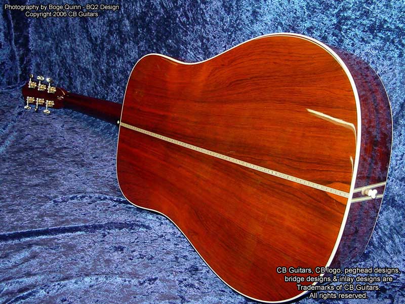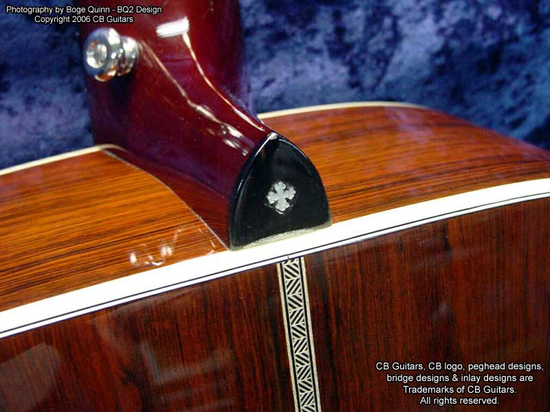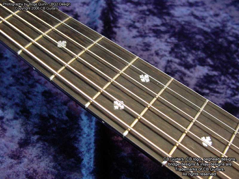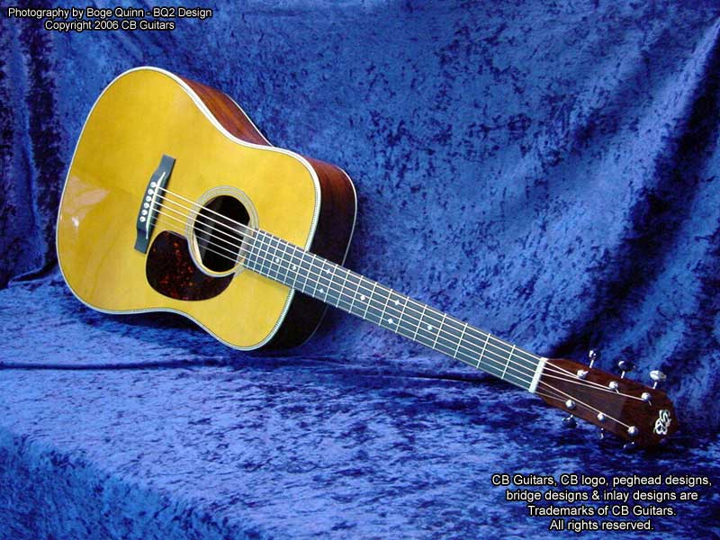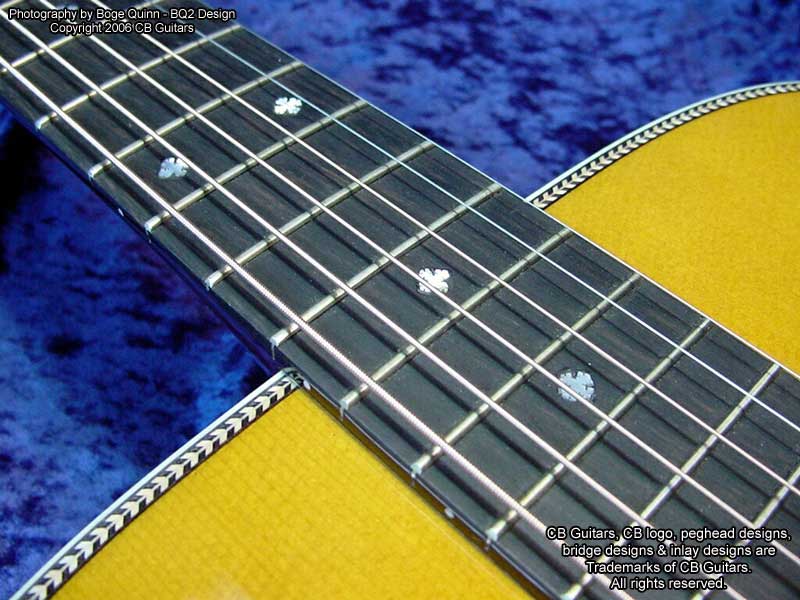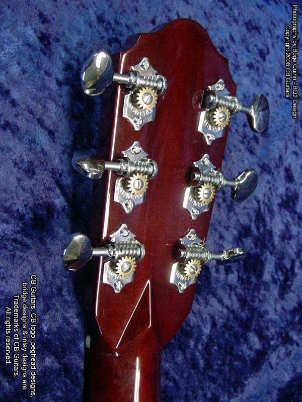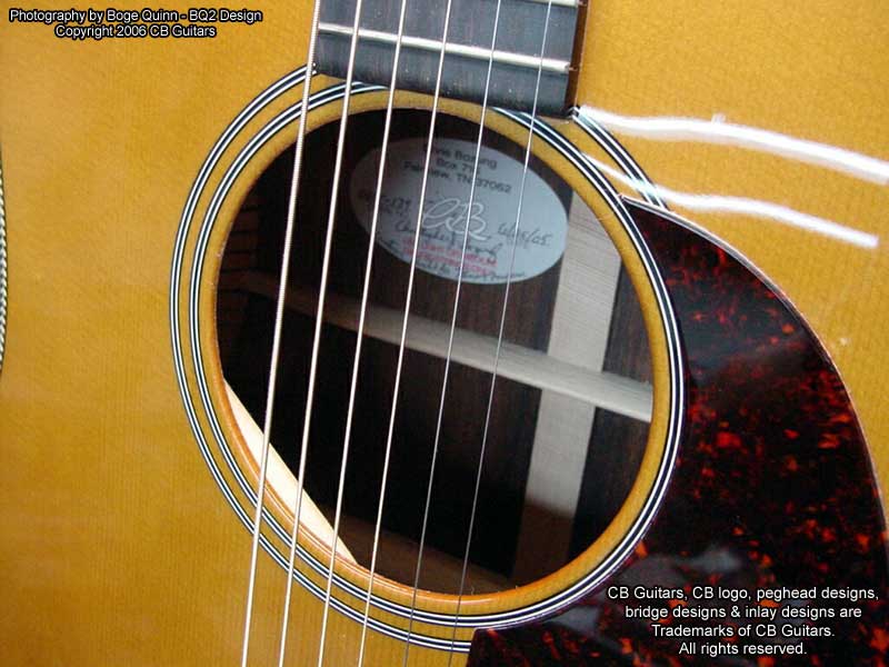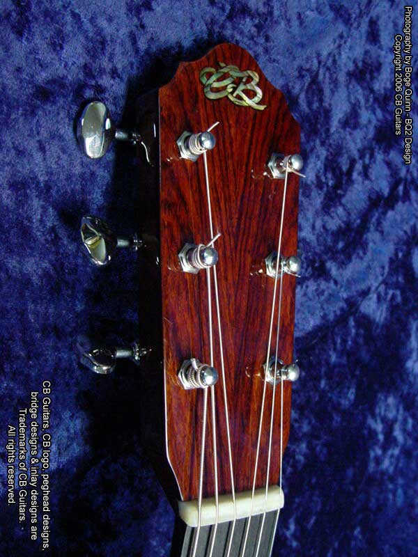 Top: Engelmann Spruce. Top Finish: Antique Natural. Top Binding: Grained ivoroid with "Herringbone" purfling. Back & Sides: Select-grade Brazilian Rosewood. Back Binding: Grained ivoroid with inner purfling. Neck: Mahogany with diamond volute. Peghead: Chris' trademark "Vintage" peghead shape with Cocobolo overlay & abalone CB logo. Tuning Machines: Nickel-plated Waverly vintage-style open-back with "butterbean" buttons. Fretboard: Ebony with "CB Snowflake" inlays. Bridge: Ebony with vintage-style "long" bone saddle & bone bridge pins.