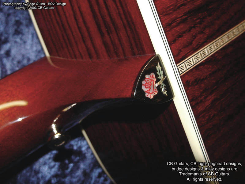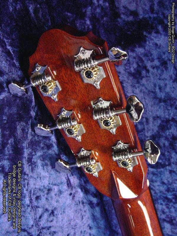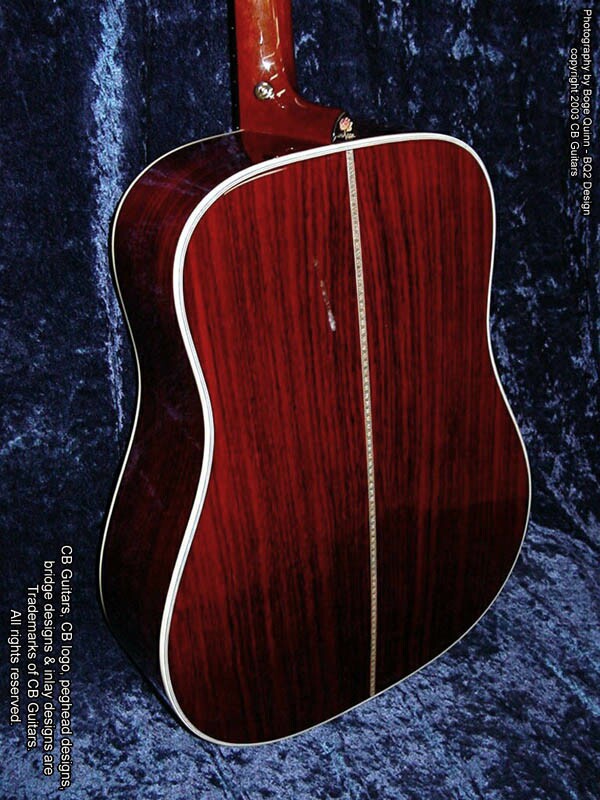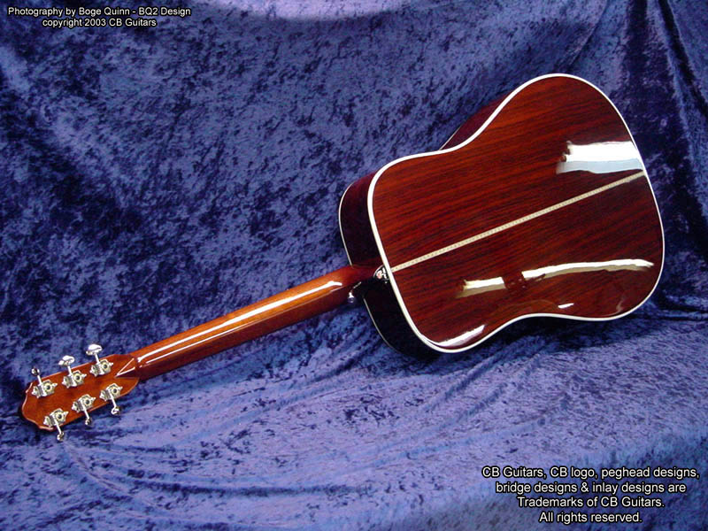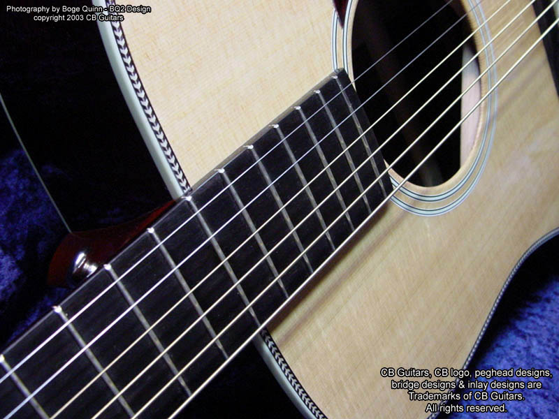 Top: Select-grade Sitka Spruce. Top Finish: Natural Top Binding: Grained ivoroid with "Herringbone" purfling. Back & Sides: Select-grade Indian Rosewood. Back Binding: Multiple grained ivoroid. Neck: Mahogany with diamond volute, "Rose" inlay on heel cap. Peghead: Chris' trademark "Vintage" peghead shape with book-matched Cocobolo overlay & abalone CB logo. Tuning Machines: Nickel-plated Grover vintage-style open-back with "butterbean" buttons. Fretboard: Ebony with no inlays (side position markers only). Bridge: Ebony.