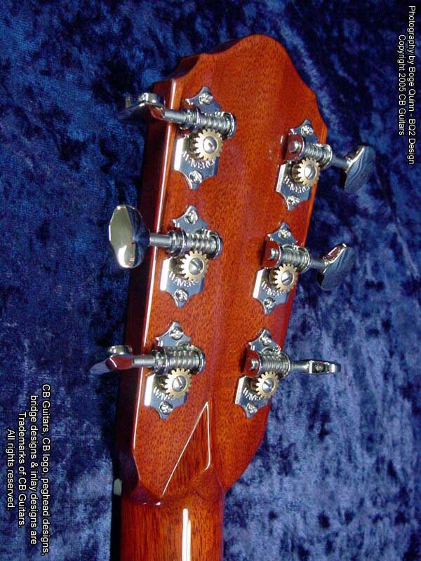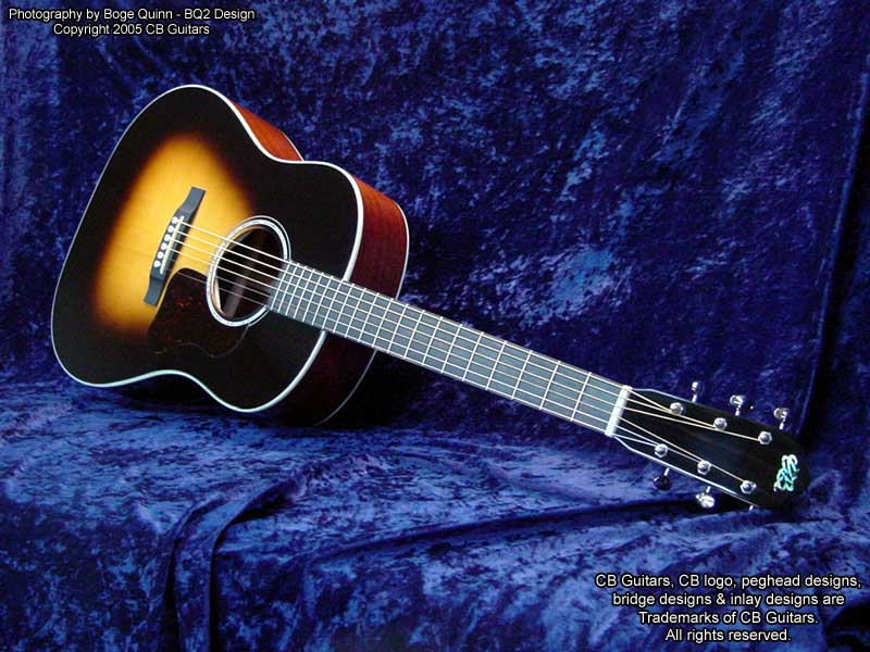 "Shallow Body" CB Vintage J in Engelmann Spruce & Figured MahoganyCreated with the full-sized (16") body width of the CB Vintage J and the shallower (4-1/8") body depth of the CB AuditoriOM, the "Shallow Body" Vintage J offers surprising volume as well a quicker response and a more "immediate" tone. The decreased size of the air chamber coupled with the full-sized sound board yields a mellow yet powerful tone in a guitar of extraordinary miking capabilities. Click this link for sound samples of CB instruments. (click pictures for larger version)