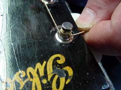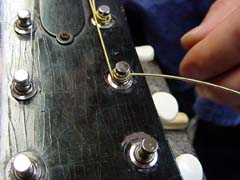 Restringing Your InstrumentsSome of the most common questions I am asked concern restringing instruments. How often should I restring? How can I tell when my instrument needs restringing? What type of strings should I use? What is the proper method for restringing? In this column, I will attempt to answer these questions. How Often Should I Restring?Even the finest instruments are no better than the strings they wear. Strings wear out at different rates for different players depending on several factors: the amount of perspiration secreted by the player's hands; the acidity of that perspiration; how often the instrument is played; the type of string used; and the climate in the area. Because there are so many factors that help determine string life, there is no one schedule for restringing that will fit all needs at all times. I have very little acid in my hands and do not tend to perspire much when I play, but I do play quite a bit, as much as several hours a day; still, a standard set of phosphor-bronze strings generally lasts at least a month for me. I have friends who have very "acidic" hands, and these guys can literally "kill" a set of strings in less than an hour. How Can I tell When My Instrument Needs Restringing?Even though we cannot accurately predict when each person in each set of circumstances needs to restring, there are "warning signs" that we can look for to help us determine when we need to restring. Since both plain (unwound) and wound strings lose their tensile strength (the ability to maintain a consistent tension along its length) over time, strings will lose their ability to stay in tune as they wear out. If you have noticed that your instrument doesn't want to stay in tune and your strings are months old, restringing may well be the solution to your problem. Perspiration and corrosion can build up in the windings of strings, killing their sound so that they have more a "muddy" sound than a "snappy" sound. If you have noticed that your instrument sounds "muddy", that the notes are indistinct and the instrument doesn't "ring" like it used to, restringing may be in order. If this is the case, you should be able to see some discoloration of the strings, usually occurring on the wound strings where your fretting hand resides and to a lesser extent nearer the bridge where you pick. Windings loosen over time, causing uneven tonal response and tendency of the strings to break. If your strings have been on for a while and you can see that the windings appear to be separating, you should change strings as soon as possible. The windings usually tend to separate over the bridge saddle and the nut (which is why string breaks so often occur in these areas), and to a lesser degree where you pick (especially if you are a fingerstyle player who uses metal fingerpicks). The new-style "coated" strings (such as Elixir® strings by Gore, Inc.) offer greatly-increased string life to many players, and I have found that they last about three times as long as standard phosphor-bronze strings (at about three times the price). They tend to have a crisper tone than uncoated strings but can sound "tinny" on some instruments (for example, I don't like them on mandolins or certain guitar body styles). The idea behind these strings is that the polymer coating will not allow contaminants to work their way into the string windings, and they work well for that purpose. As these strings age, the coating is picked away from the string windings and begins to fray; after some time, the strings actually begin to look "hairy" around the area where the pick comes in contact with the string, appearing as though they are covered in fine white hair. Shortly after they assume this appearance, their sound will begin to deteriorate and they will become prone to breakage, so this serves as a very good indicator of when this type of string needs to be changed. What Type Of Strings Should I Use?There are many different brands and types of strings available, and the type of strings to use depends on many factors such as type of instrument, type of music you play, the conditions you play in, and of course your subjective taste. I suggest you try several different brands and see what you like the best, bearing in mind that every instrument is different and the strings that sound the best on one instrument may not be the best for another. However, I have found that most guitar players' needs are met by a good phosphor-bronze acoustic medium-gauge string, such as the D'Addario brand. I play D'Addario strings myself, and I install D'Addario phosphor-bronze medium-gauge strings on all new CB guitars. Please remember that heavy-gauge strings will destroy a finely-crafted instrument, and the use of heavy-gauge strings will void the warranty on most high-quality instruments (including mine). What Is The Proper Method For Restringing?It seems there are almost as many methods for restringing as there are people who accomplish the task. However, people who ask me how to restring want to know how I do it, so here goes: First of all, and I know many would disagree with me on this, do not remove all the strings at once. Replace your strings one at a time. The reason for this is simple: a neck and truss rod becomes "loaded" structurally to properly support a certain pull weight, and repeated loosening and re-tensioning of the full force of string tension can result in failure of the truss rod, warping of the neck wood, or undue stress on the neck/body dovetail joint. This may seem a bit extreme, and it is indeed unlikely that the practice of changing strings all at once would have a catastrophic result such as truss rod breakage, but the neck of your instrument is a finely tuned system. Repeatedly removing all tension and restoring in can in fact damage the neck, just as bending a piece of metal back and forth repeatedly can break it. You can clean and oil your fingerboard underneath the strings or a bit at a time as you remove in
